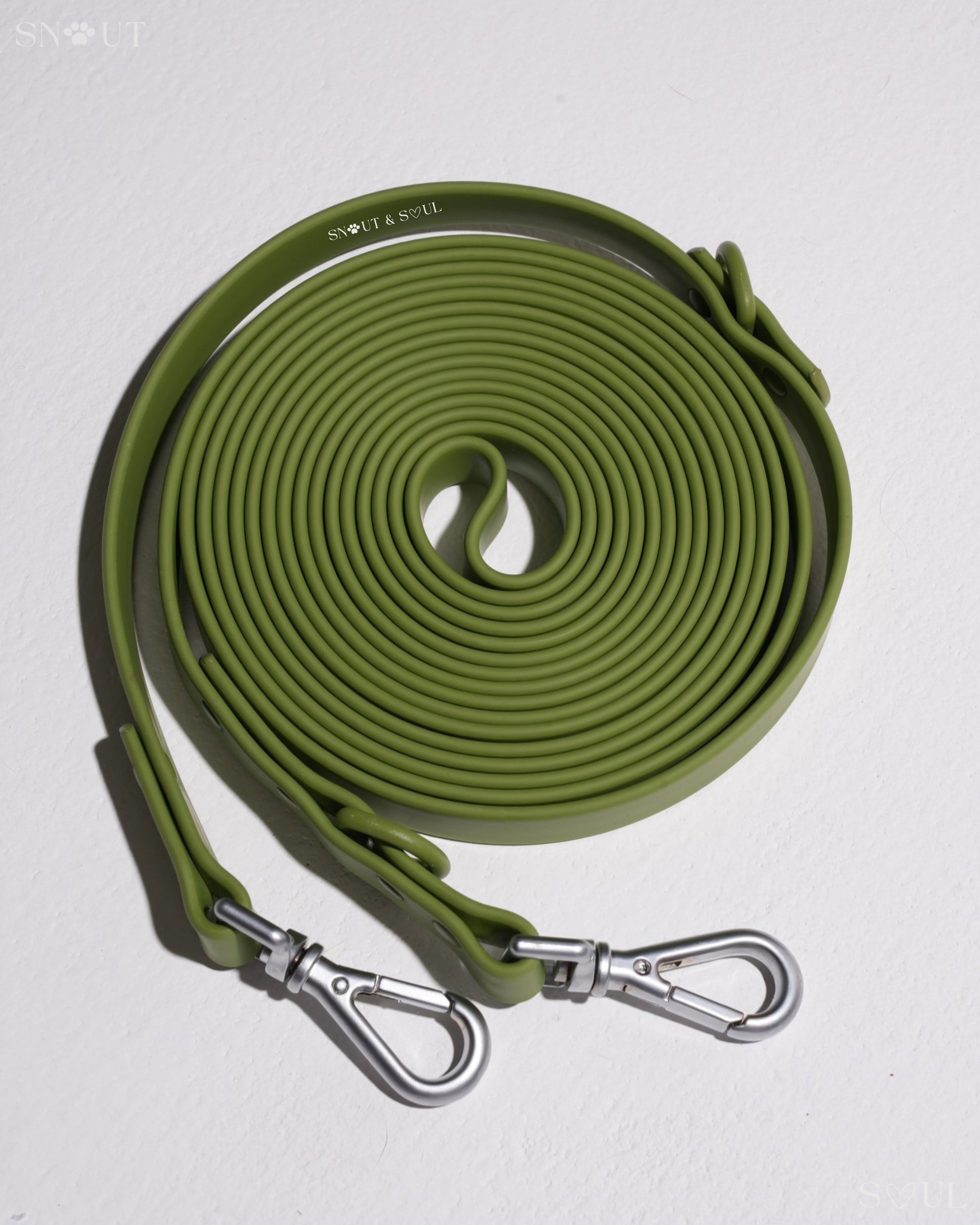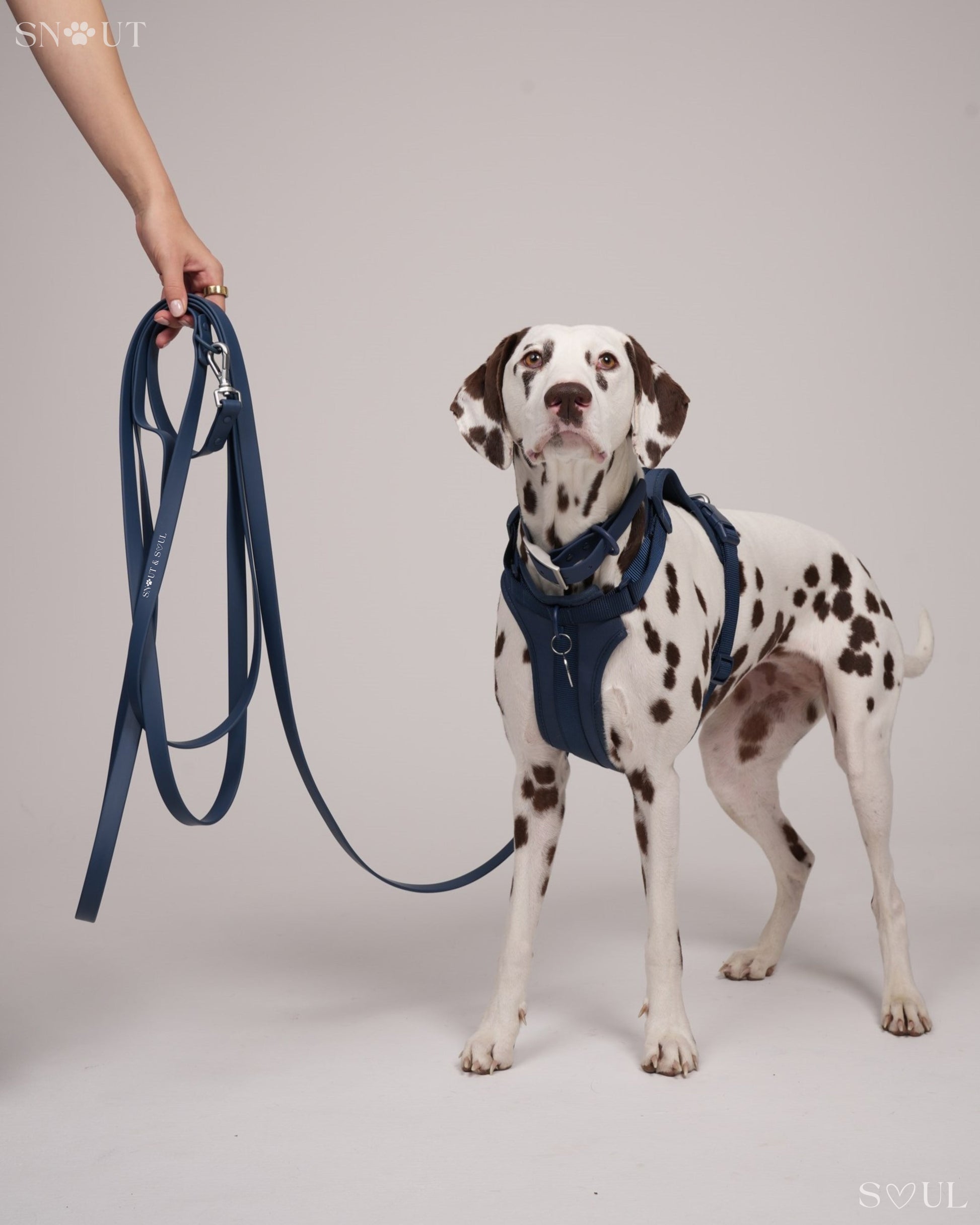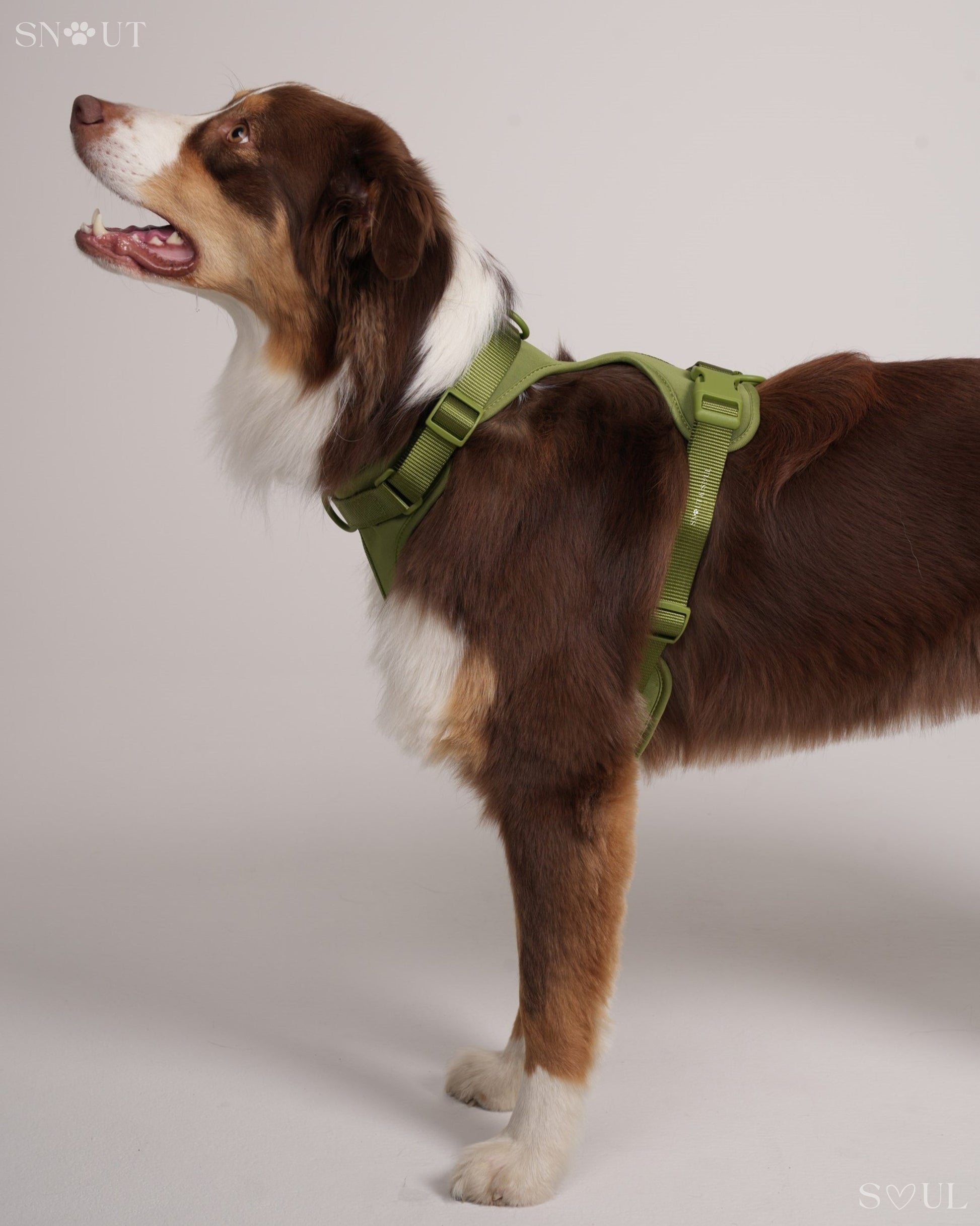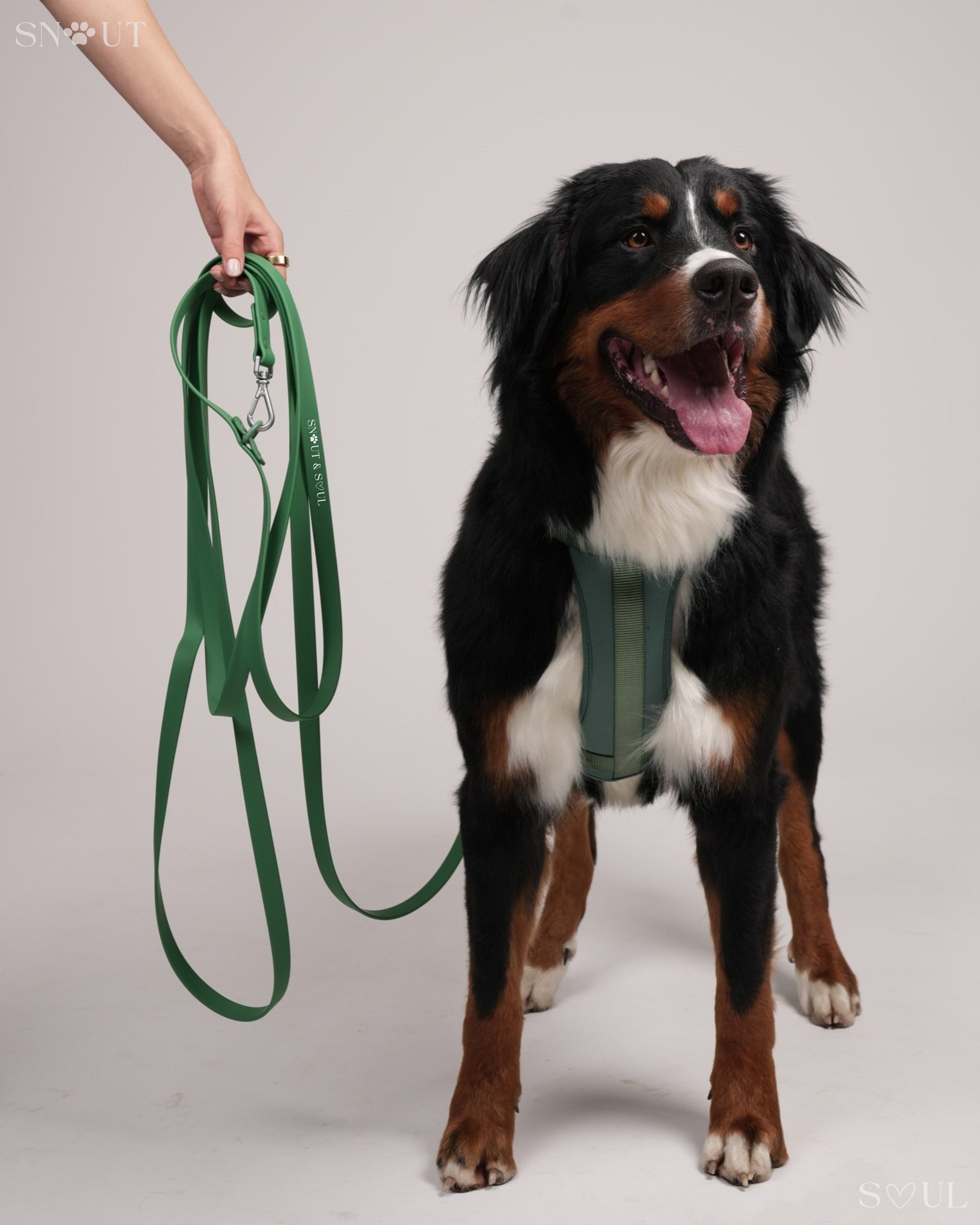 Ich bin mit dieser Firma äußerst zufrieden! Ich habe für meinen Hund ein Set bestehend aus Geschirr, Leine und Halsband von Snout & Soul gekauft. In Olivgrün!