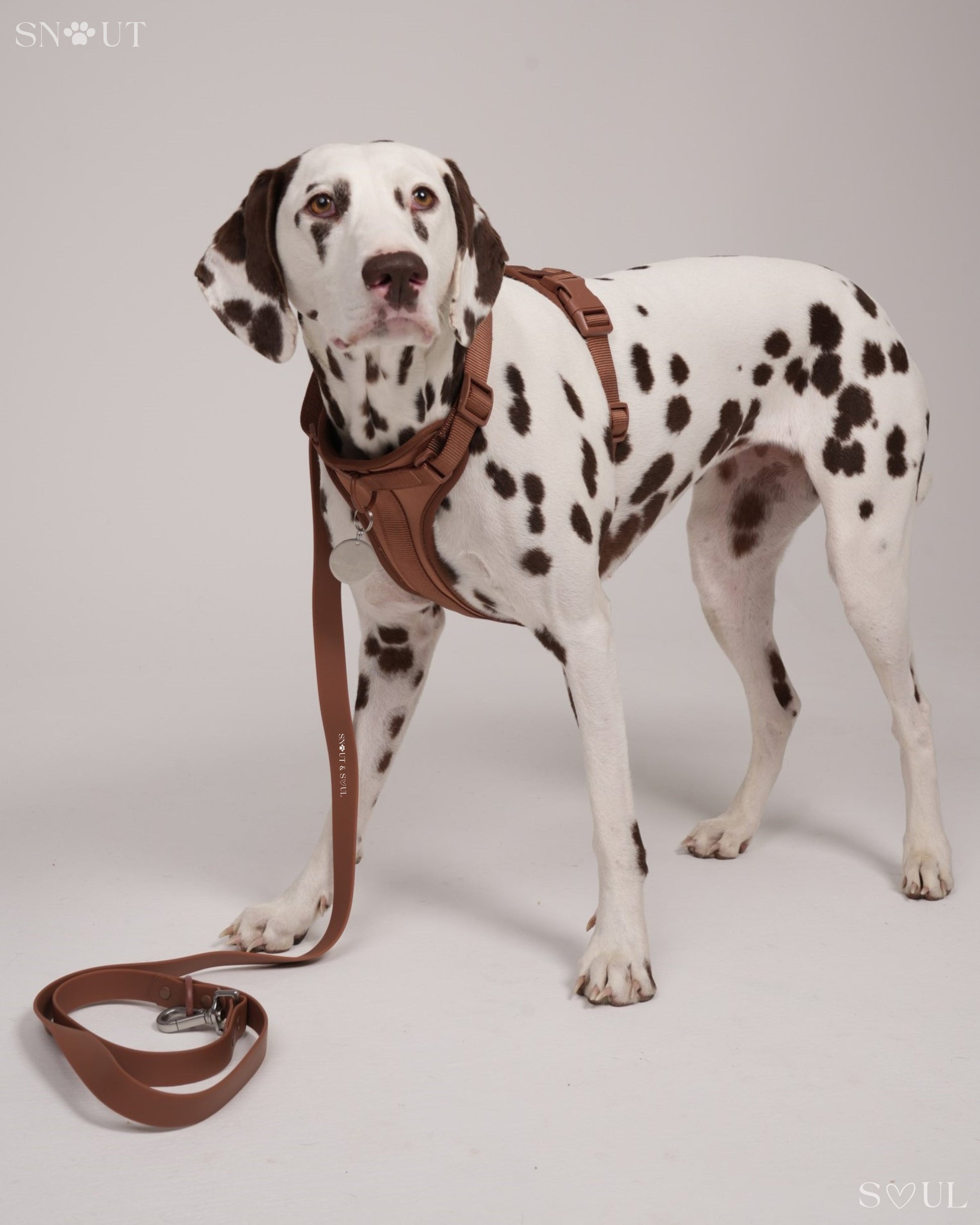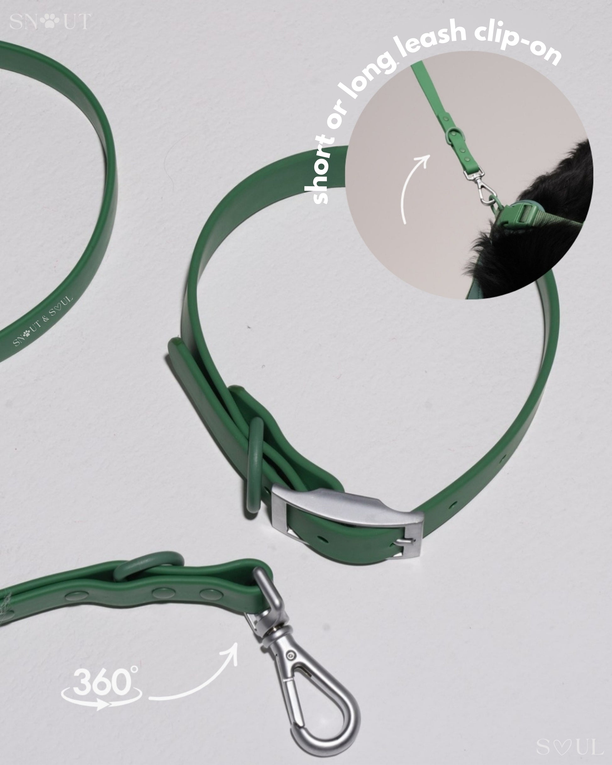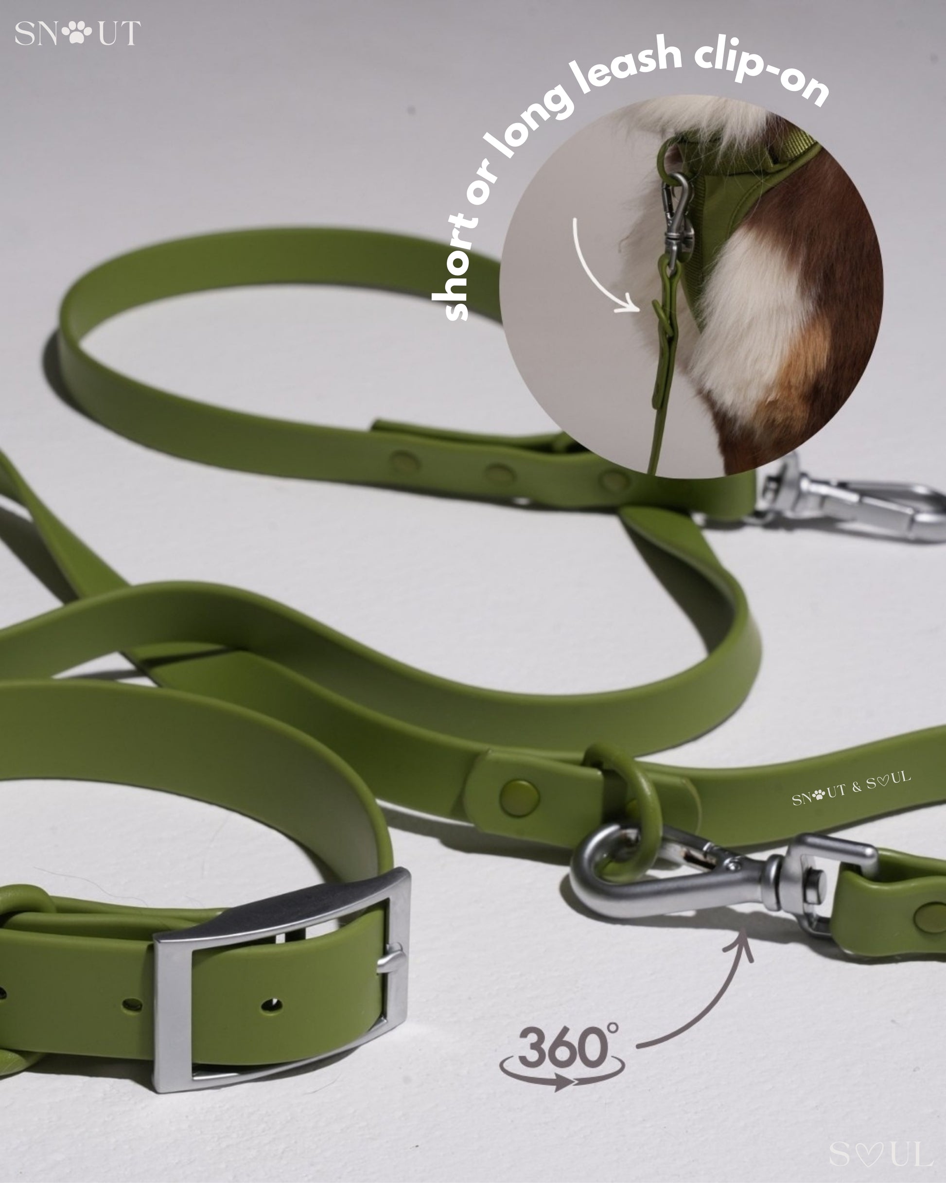 Ich bin mit dieser Firma äußerst zufrieden! Ich habe für meinen Hund ein Set bestehend aus Geschirr, Leine und Halsband von Snout & Soul gekauft. In Olivgrün!